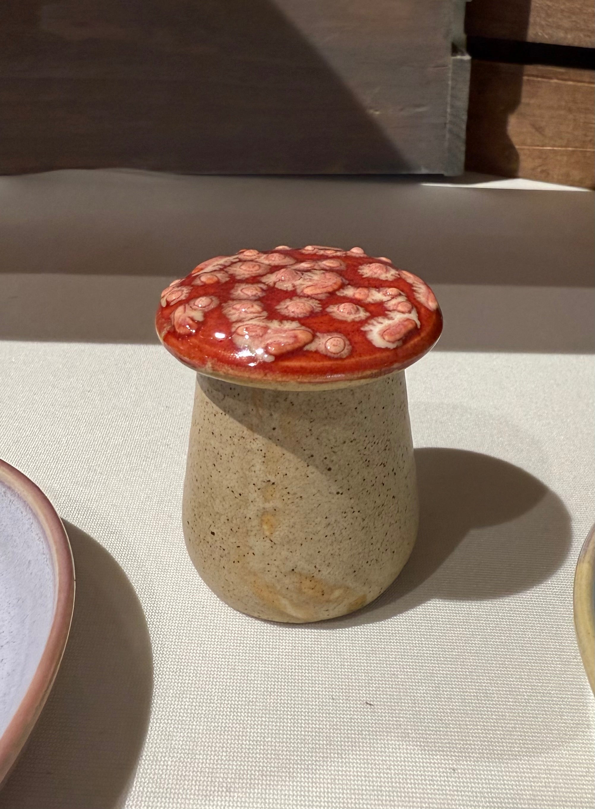 Wheel thrown and hand decorated amanita muscaria inspired mushroom trinket jar.